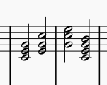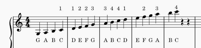 This drawing names all the notes on a staff, A to G, and numbers the notes of two chords, 1 to 4. The two chords are C and Dm.